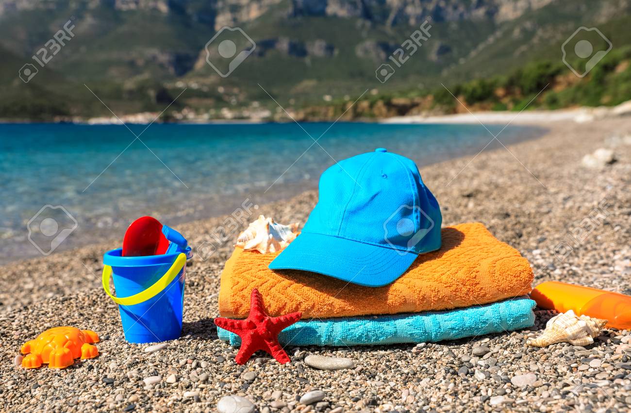 Immagini Stock - Asciugamani Da Spiaggia, Berretto, Giocattoli Per Bambini, Conchiglie E Crema Solare Sulla Spiaggia Su Uno Sfondo Di Mare E Montagne, Estate Vacanza In Famiglia Dal Concetto Di Mare. Orizzontale.